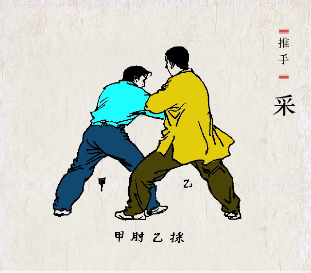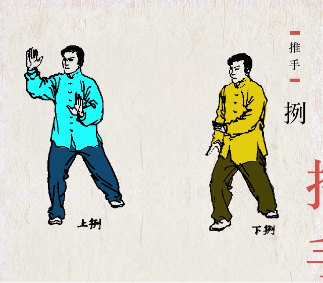 推手双方必须保持手臂粘连不脱,以静待动,以柔克刚。通过身体的触觉,探知对方劲力的大小、方向、部位与虚实,及时做出反应。一切从实际出发,急则急应,缓则缓随,审时度势,避实就虚,舍己从人,乘势借力,引进落空,用小力胜大力,即所谓:“任他巨力”,而“牵动四两拨千斤”。总的要求是:能化能发,化劲松静,放劲干脆。