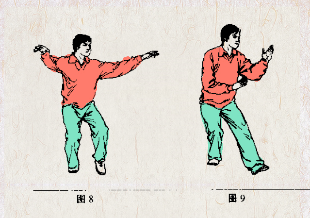 1.定势时两腿虚实分明,屈腿落胯,收臀缩耽,后腿稳固屈撑;前腿微屈,膝关节松活,脚跟轻轻支撑。同时上体保持松正,侧向前方,顶头沉肩,圆臂虚腋,坠肘含胸,塌腕舒指,内劲贯于头顶、指尖。