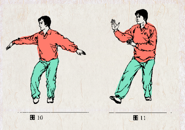 3.右腿感觉酸热时,左脚轻轻收回,上体右转,体重移于左腿,右脚向右前方移动半步,换成右虚步。同时两臂动作也随之收落、上举,两手合于体前成右势(见图10、11)。如此反复练习。
