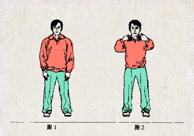 两臂徐徐上举,于胸前环抱,如同围抱大树状。掌心向内,五指自然分开,掌指微屈,掌心内含,指尖相对,相距约一拳宽。目视前方或指尖(见图2)。