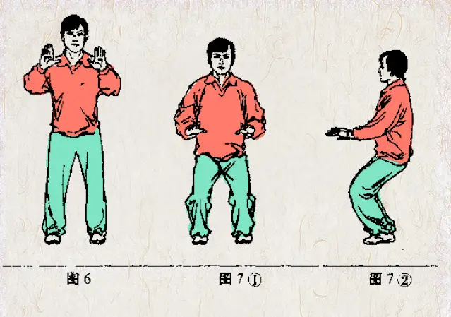 与简化太极拳起势动作相同。由预备势开始,两手徐徐前平举,高与肩平,宽同肩宽,掌心向下。稍停,两腿徐徐屈蹲,两手随之向下轻按至腹前。稍停,再徐徐起立,两手提至原来位置。如此反复练习(见图6、7①、7②)。