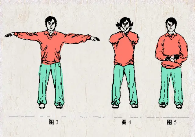 两手经体侧划弧上举至肩高处,同时吸气。随之两手掌心翻转向内划弧,于头前交叉合拢,再经胸前徐徐落于腹前,同时呼气。如此循环练习。两手交叉划成立圆,划圆时手高不过顶,低不过档(见图3、4、5)。