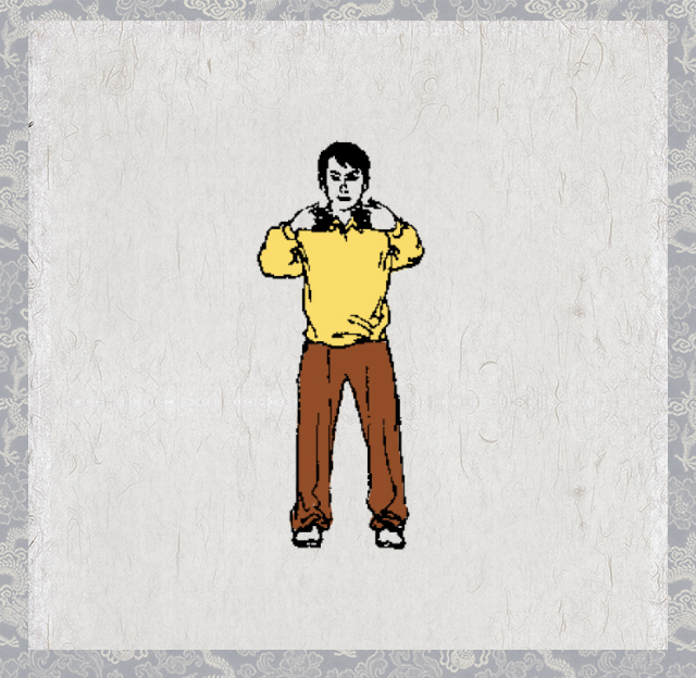 2.悬顶正容,松腰竖脊,沉肩含胸,展臂舒指,全身保持松而不懈、实而不僵的自然舒展状态。