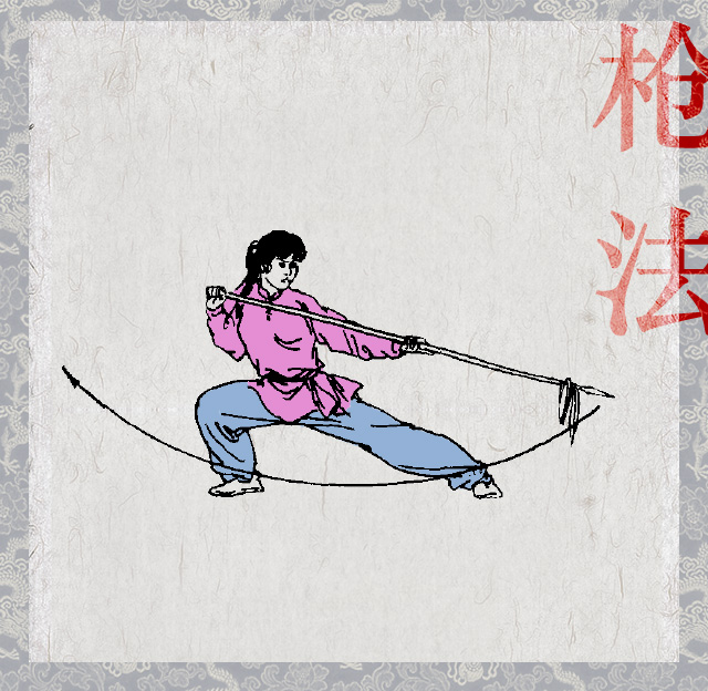 古代“枪法”是指用于战阵中枪的拼刺技术,表现形式多为单招和对刺,着重于用枪的力度和拼杀的实效性。现代“枪法”主要指构成枪术套路(单练、对练、集体演练)的基本动作。在强凋攻防含义的前提下,着重于枪术方法的多变和身体姿势的舒展美观。