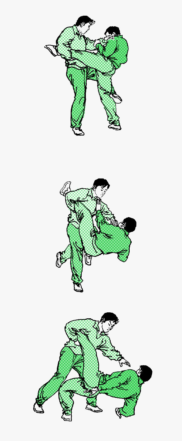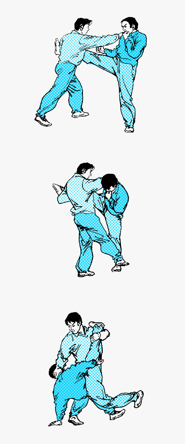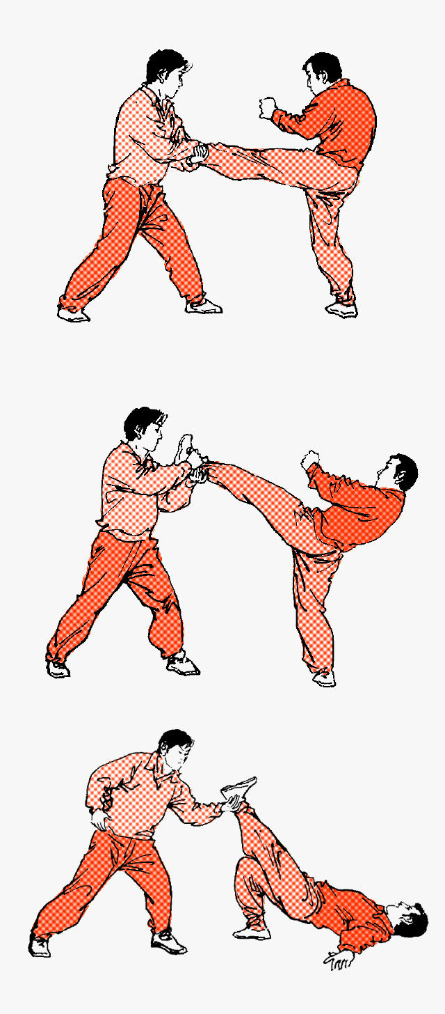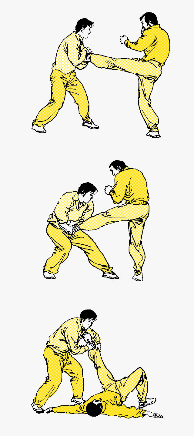 接腿勾踢 接腿摔法之一。被时手以右弹腿攻击肋部,遂外抄其来腿并夹抱住,尔后伸右臂切压其颈部。右脚向前勾踢其支撑腿踝关节,而勾倒之。