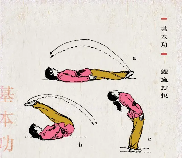鲤鱼打挺武术腾翻动作之一。亦称蹬足起。身体倒地后仰,收腹举腿,然后迅速双手扶腿挺腹,而腿下打宽不过肩,梗头摆振而起,起立轻快有力。