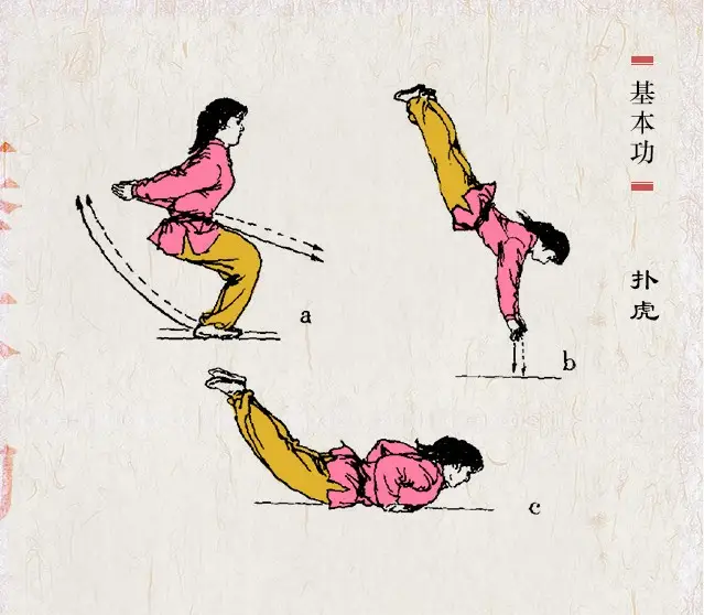 扑虎武术跌扑动作之一。两腿蹬地向前上跃起腾空,双手撑地后,两腿迅速上摆儿近倒立。继而屈臂下落,落地要轻,手、胸、腹、膝、大腿依次着地,两腿稍屈并拢或稍分开,同时撑臂、抬头、挺胸,使身体呈弧形滚动,而后起立。