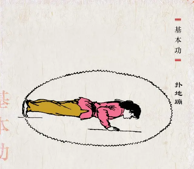 扑地蹦武术跌扑动作之一。身体挺直俯卧,双腿并拢,两脚前掌着地,双臂屈,手撑地,而肘夹紧,以两臂之推力,双脚掌之蹬地及腰背肌之提力,使整个身体在地面上蹦弹,平起平落,轻快连续。通常以头为圆心蹦转一周。