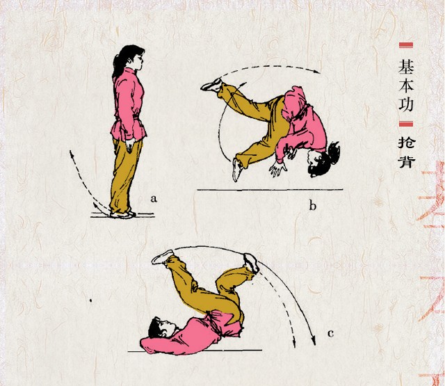 抢背武术滚翻动作之一。以抢、卧、滚、踢组成。一脚蹬地起跳腾空前跃;另一腿微屈向后上摆起。继而双手向前扶地,低头屈身,肩、背、腰、臀依次着地向前翻滚一周,轻快圆活,而后迅速起身。